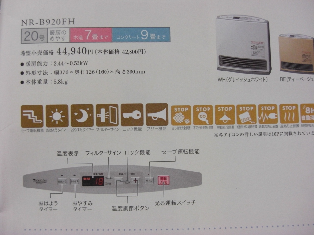・暖房めあす/木造7畳まで/コンクリート9畳まで・暖房能力/2.44〜0.52kw